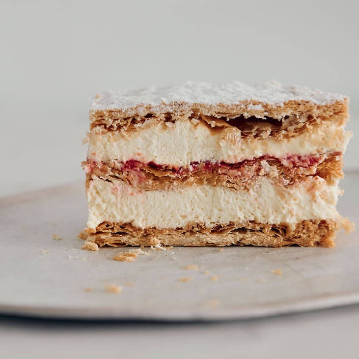 Three levels of French butter puff pastry sandwich between two levels of Australian fresh cream